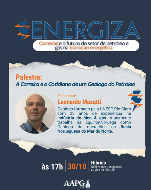 Esta será a primeira palestra do Ciclo de Palestras da AAPG USP ENERGIZA – carreiras e o futuro do setor de petróleo e gás na transição energética.
