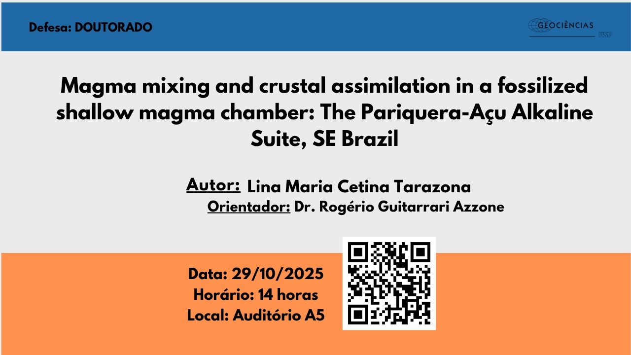Comunicamos que no dia 29 de outubro de 2025, às 14h00, no Auditório A5 do Instituto de Geociências da USP, link de transmissão do YouTube https://youtube.com/live/KBgANu2aav0, será realizada a defesa de Tese de Doutorado de LINA MARIA CETINA TARAZONA, intitulada: