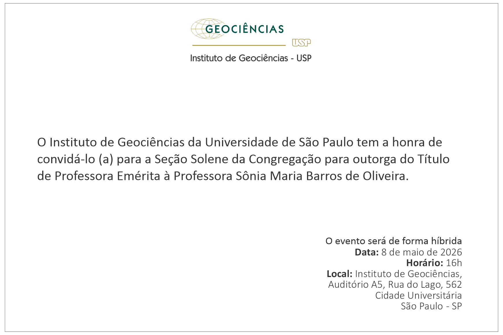 Auditório A5 - IGc/USP Rua do Lago, 562, São Paulo, São Paulo, BrazilO Instituto de Geociências da Universidade de São Paulo tem a honra de convidá-los para a Sessão Solene da Congregação, na qual será outorgado o Título de Professora Emérita à Profª. Sônia Maria Barros de Oliveira....